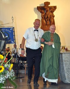 August 2022 Die erste Auszeichnung kam in der Hl. Messe, vor dem Segen. Präses Pfarrer Michael Schicks setzte sich noch mal gemütlich hin, da Bezirksbundesmeister Horst Thoren das Wort ergriff. Thoren: „Ich nehme gerne diese Ehrung in der Kirche vor, da es den Pfarrer betrifft.“ Weiter ging er auf die Predig ein und meinte: „Schicks predigen zu hören, ist ein Vergnügen. Er ist ein besonderer Mensch und Pfarrer.“